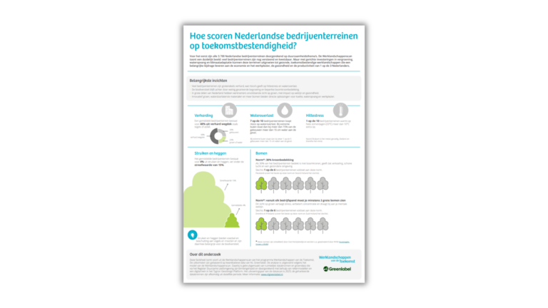 70% van de Nederlandse bedrijventerreinen is slecht voorbereid op wateroverlast door klimaatverandering. Ook heeft 5 op de 6 terreinen een duidelijk tekort aan groen. Dat blijkt uit een analyse van Werklandschappen van de Toekomst, waarin voor het eerst alle 3.713 Nederlandse bedrijventerreinen zijn onderzocht op klimaat, gezondheid en biodiversiteit.