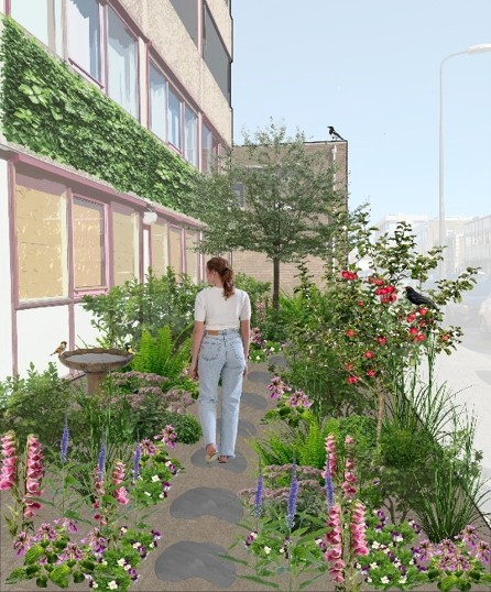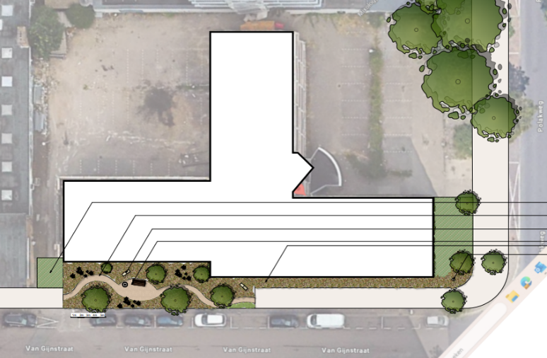 Vanuit IPP Haaglanden, een samenwerkingsverband tussen de gemeenten Rijswijk en Den Haag, zijn de eerste stappen al gezet. Bij de Van Gijnstraat 30 is een geveltuintje aangelegd en een aantal parkeerplaatsen met halfverharding en bomen. Aan de overkant van de weg gaat het pand binnenkort verduurzaamd en vergroend worden, en ook daar nemen we de buitenruimte mee. Zo krijgt de eerste hotspot al vorm!