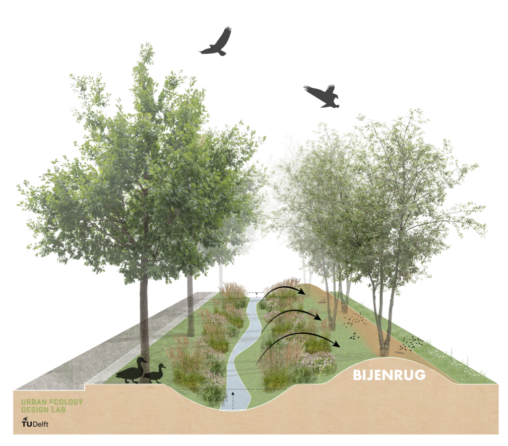 Een bijenrug is een lijnvorming element van deels stabiele kale grond. Hierin kunnen bijen nestelen, 70% van onze bijensoorten nestelt immers in de grond. De bijenrug wordt verrijkt met vegetatie, die specifiek wordt gekozen voor de beoogde doelsoorten. Het voorziet de bijen in hun behoeften en biedt voldoende broed- en voedselgebied. Het vermindert de afname van soorten door de bereikbaarheid van verschillende biotopen binnen hun netwerk te vergroten. De eerste bijenrug op de TU Delft Campus is opgeleverd eind december 2024 en aangeplant in januari 2025. De wilde bijen op de campus worden gemonitord.