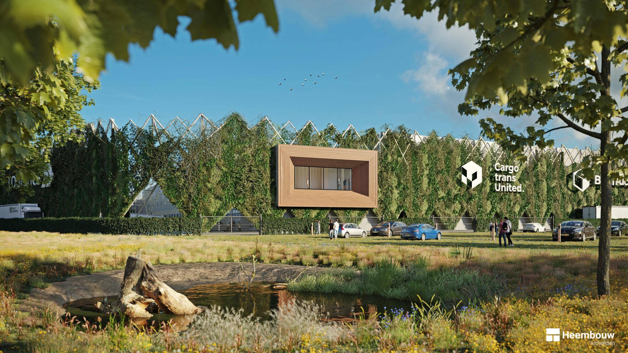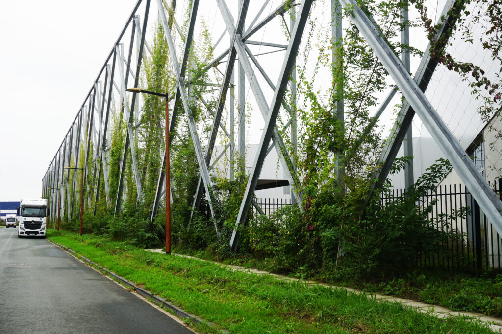 Het volledig met planten begroeide scherm is een prachtige ecologische strik om de bestemming heen. Het klimaatadaptieve natuurscherm wordt duidelijk zichtbaar langs de A35 en vormt een sluier om de bedrijvige logistieke binnenwereld.