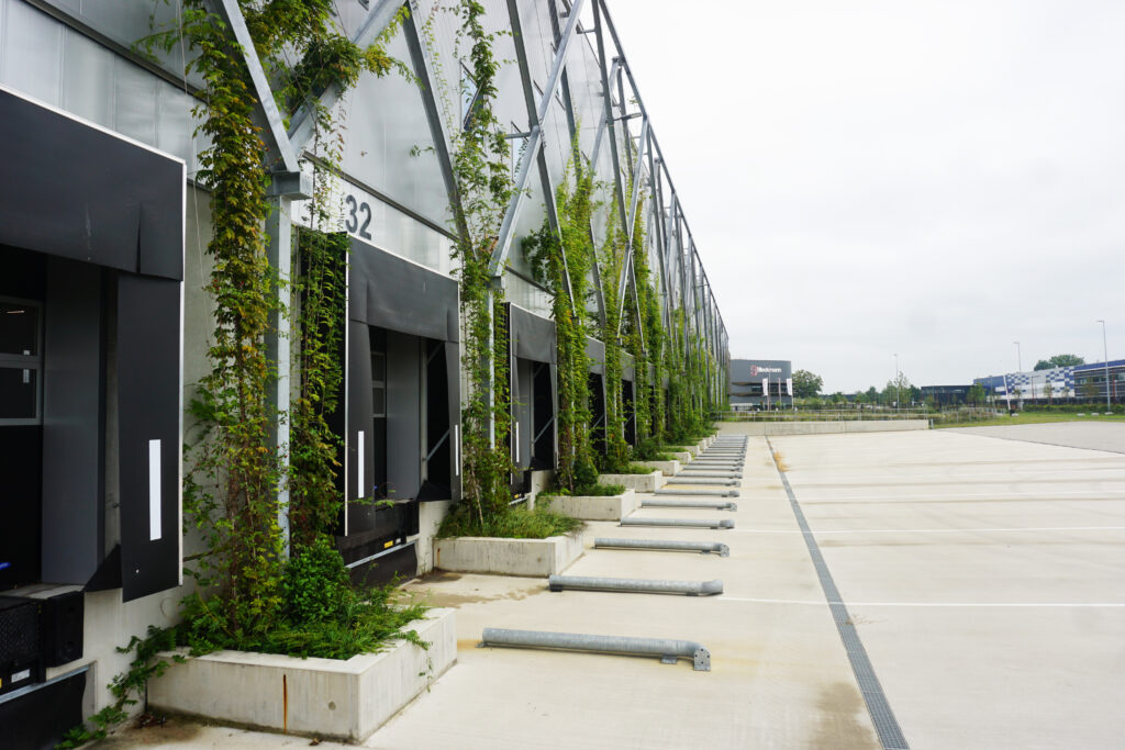 Het ecologische natuurscherm creëert een binnen- en buitenwereld. De buitenwereld is maximaal natuurinclusief: bloemrijk gras, half verhard waar mogelijk, klimaatadaptief en natuurlijk zo biodivers mogelijk met nestmogelijkheden voor verschillende soorten dieren. De binnenwereld is volledig ingericht op logistieke efficiency.