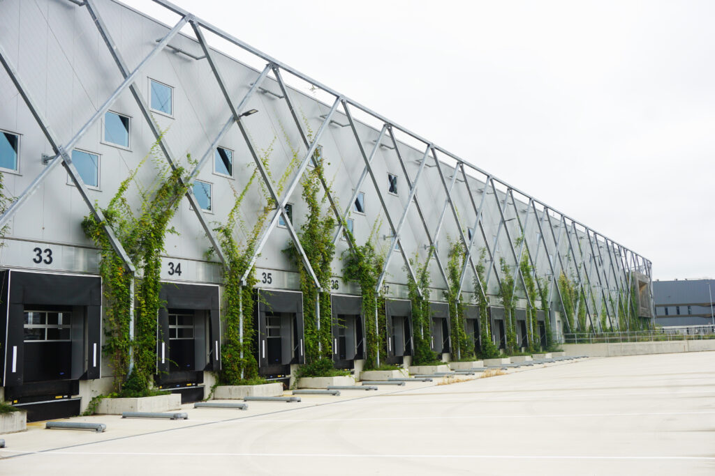 Het ecologische natuurscherm is deels tegen het gebouw, deels vrijstaand en zelfs deels boven de laaddocks gepositioneerd. Het ontwerp van het scherm bestaat uit verticale basisportalen, waartegen een stalen frame met diagonaal lijnenspel is aangebracht. Hiertussen zitten klimhulpen zoals stalen netten, waarlangs de vegetatie gericht omhoog kan klimmen.
