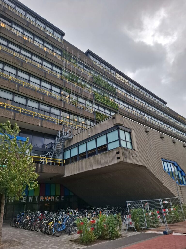 De groene gevel is aangebracht op het brutalistische gebouw van de faculteit Civil Engineering and Geosciences op de campus van de TU Delft. Op dit gebouw uit de jaren zestig zijn zowel plantenbakken als living wall-panelen geïnstalleerd. Vanuit de plantenbakken groeien verschillende soorten klimplanten omhoog via kabels en gaasconstructies.