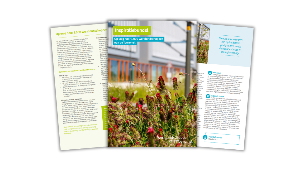 Op verschillende plekken in het land zijn voorlopers al langer aan de slag met groene innovaties en samenwerkingsverbanden. Wat was hun aanpak, welke resultaten behaalden ze en welke lessen hebben ze geleerd? In de inspiratiebundel Op weg naar 1.000 Werklandschappen van de Toekomst lees je vier casebeschrijvingen.