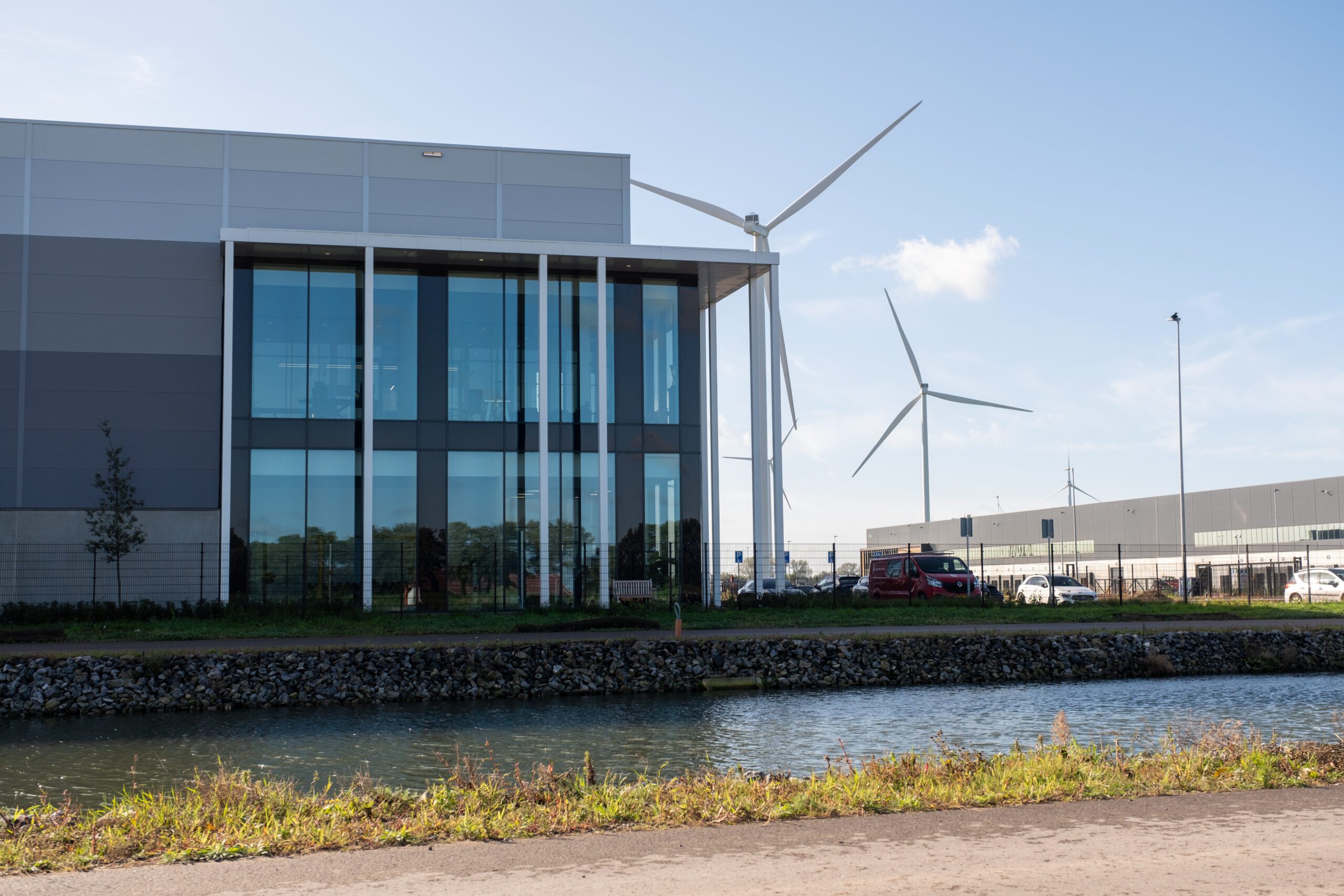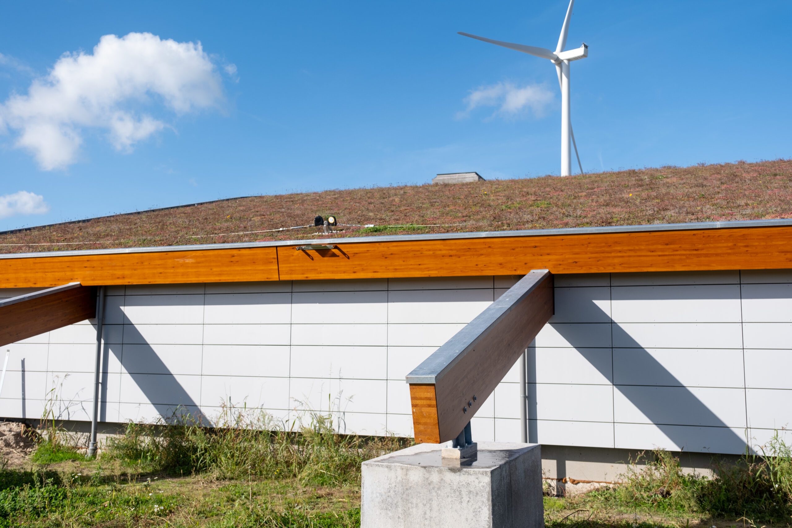 Bouwvakkers zijn bezig aan de laatste werkzaamheden voor het Kenniscentrum ROOTZ, dat aan een opvallend, oplopend groen sedumdak heeft. ‘Een verplichting voor alle gebouwen op het terrein is om de daken vol met zonnepanelen te leggen’, vertelt Remco van Dessel, projectleider van Business Centre Treeport. ‘Dat kon bij dit kenniscentrum niet, daarom zijn we uitgeweken naar het water. Daar hebben de zonnepanelen bovendien hogere opbrengsten, want het water werkt verkoelend.’ De zonnepanelen zorgen samen met twee windturbines ervoor dat het terrein energieneutraal is, en zelfs 40 procent van alle energie voor de gemeente opwekt.