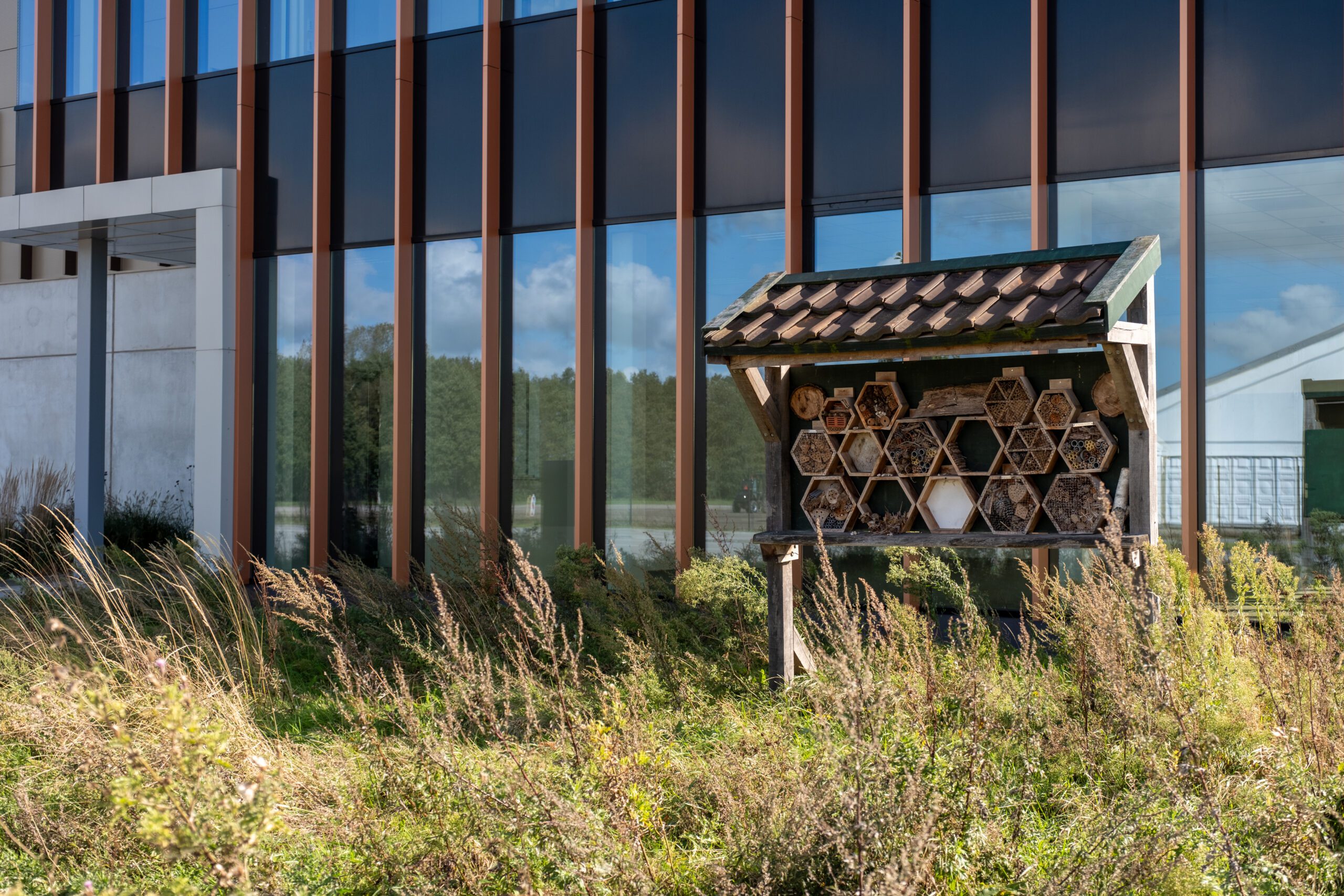 Aan alle kanten rondom is gezorgd voor mooie overgangen naar het achterland. Werknemers kunnen tijdens hun pauze een wandeling maken over het waterdoorlatende granulaatpad waarmee het terrein is omzoomd. Stroken zijn ingezaaid zadenmengsels voor insecten, voedselstruiken en schuilplaatsen. Van Dessel: ‘Uiteindelijk werken alle bedrijven met mensen die het fijn vinden om in een groene wijk te wonen. Maar de meeste tijd brengen ze door op hun werk. Als je in een mooie omgeving werkt, kun je ook makkelijk aan personeel komen.’